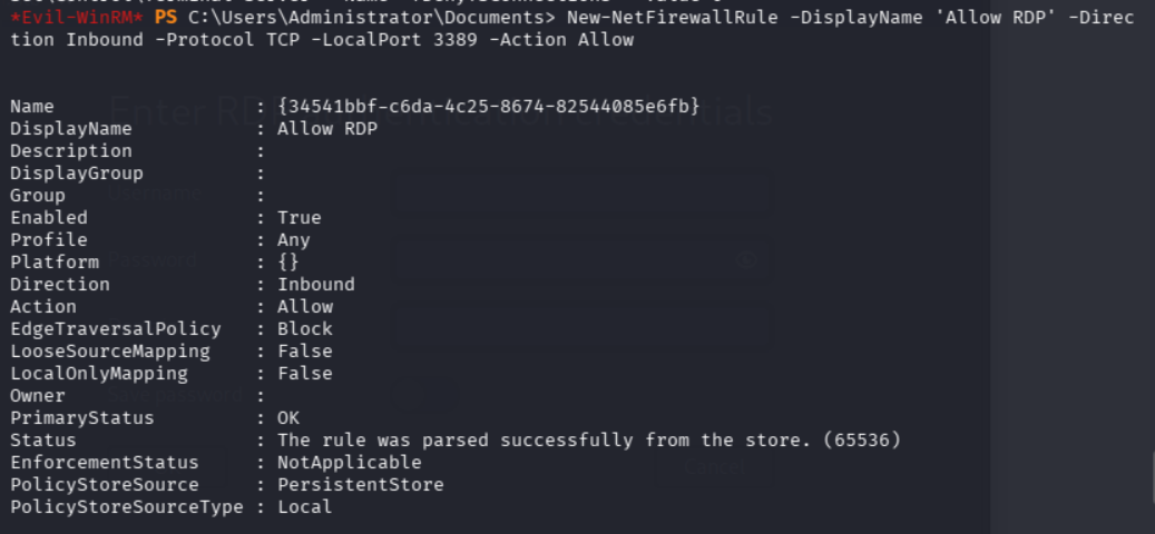 New-NetFirewallRule -DisplayName 'Allow RDP' -Direction Inbound -Protocol TCP -LocalPort 3389 -Action Allow