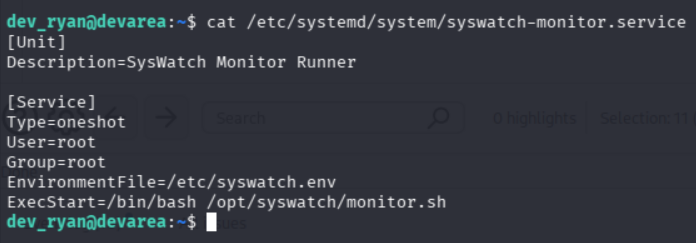 在检查结果中存在一条 /etc/systemd/system/syswatch-monitor.service 调用 /bin/bash 程序,而在前面信息又得知,syswatch是可以以root权限执行的
