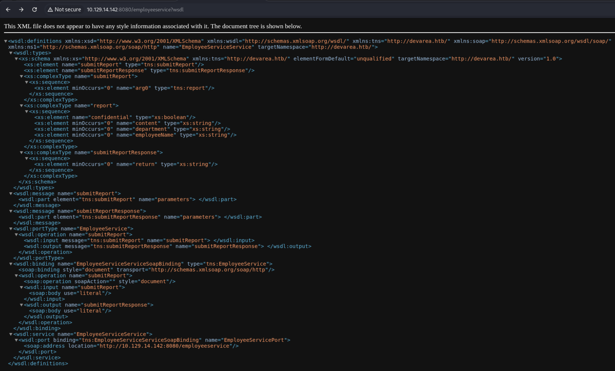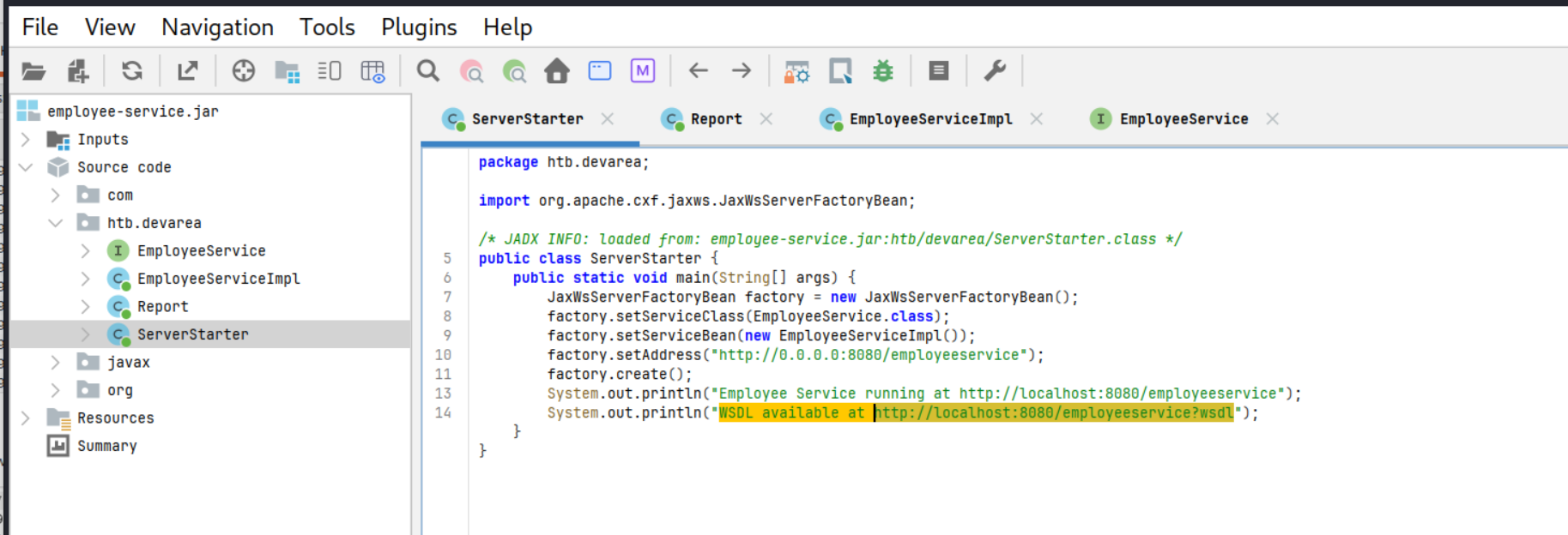 在 Source code > htb.devarea > ServerStarter 中发现存在目标地址 http://localhost:8080/employeeservice?wsdl