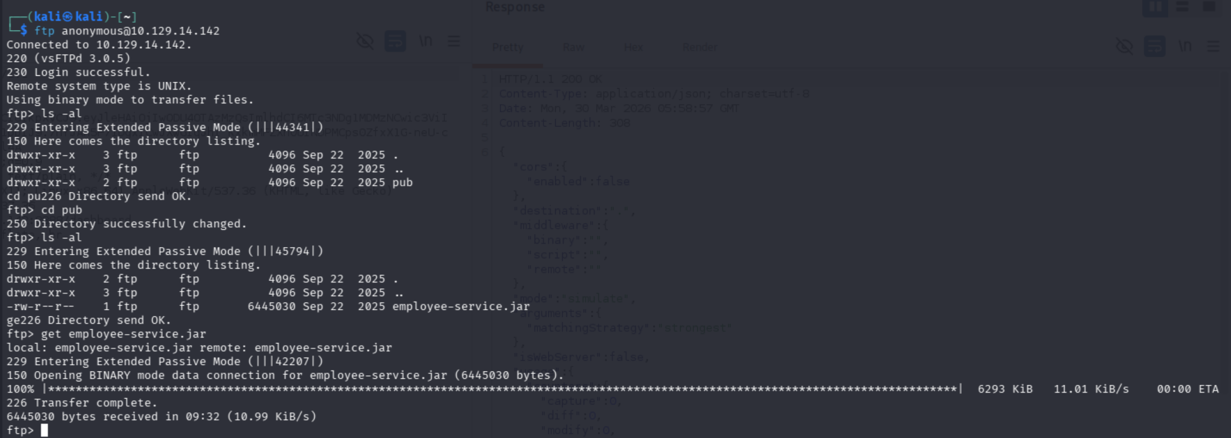 ftp anonymous@10.129.14.142登录ftp使用cd、get 命令进入目录和下载文件,发现存在文件employee-service.jar(过程见下图)