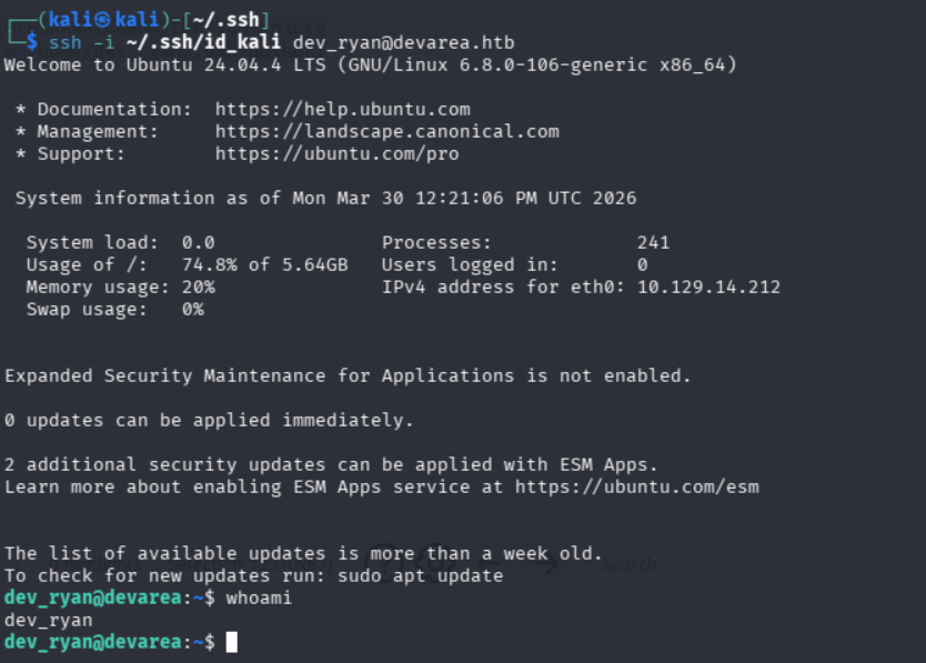 ssh -i ~/.ssh/id_kali dev_ryan@devarea.htb直接ssh登录靶机